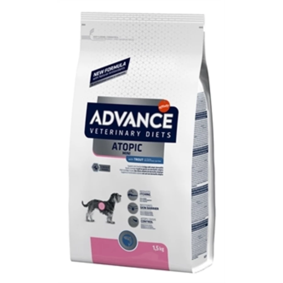 Advance Veterinary Atopic Mini 1,5 kg is een dieetvoer voor volwassen honden van kleine rassen met huidproblemen als dermatitis en haaruitval. Ook ideaal voor honden met huidproblemen ten gevolge van intolerantie door bepaalde ingrediënten: die helpt dit voer te verminderen. Het voer is samengesteld volgens een formule die de huid van honden met dermatitis helpt te beschermen.
