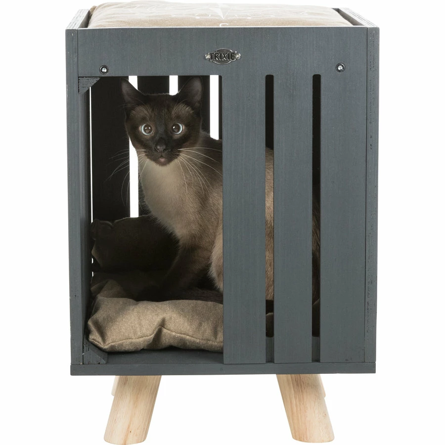 Schuilplaats Alva is een zachte plek waar uw kat tot rust kan komen. Deze schuilplaats bevat een wendbaar kussen welke aan voelt als canvas (polyester) en vulling van polyestervlies. Het kussen kan met de hand gewassen worden. De kist bevat houten pootjes en is gemaakt van gelakt triplex. Het draagvermogen van de schuilplaats is max. 40 kg.
