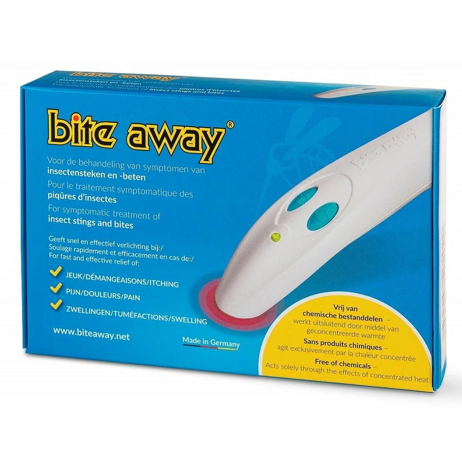 De Bite Away is het nieuwste middel om de jeuk en pijn te verlichten na een beet van onder andere een mug, bij of wesp. De Bite Away verwarmt de huid tot 50 graden om zo de het gif van de insecten af te breken. Het kan zelfs tot 2 dagen na de beet of steek nog worden toegepast.