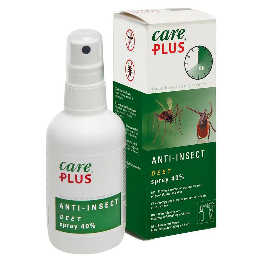 De anti-Insect deet spray van Care Plus bevat 40% deet. Hiermee bent u tot 8 uur beschermd tegen bijna alle soorten muggen inclusief de malariamug en de gele koorts mug. Ook biedt de spray tot 4 uur bescherming tegen teken en is het middel ook effectief in het weren van stalvliegen, kriebelmuggen, goudoogdazen en (chigger)mijten.