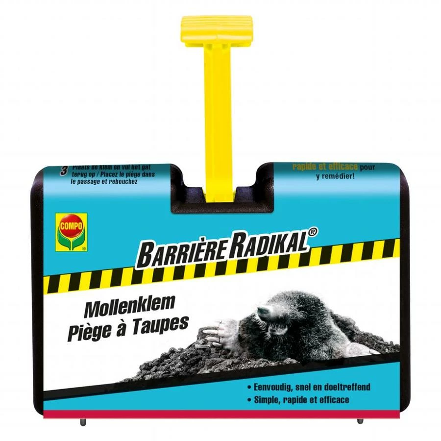 De COMPO Barrière Radikal Mollenklem is een compacte maar ook stevige mollenklem. De klem is eenvoudig in het gebruik. U hoeft alleen de hendel naar beneden te drukken om deze scherp te stellen. Door de constructie is de kans klein dat de val niet werkt door aarde of stenen.