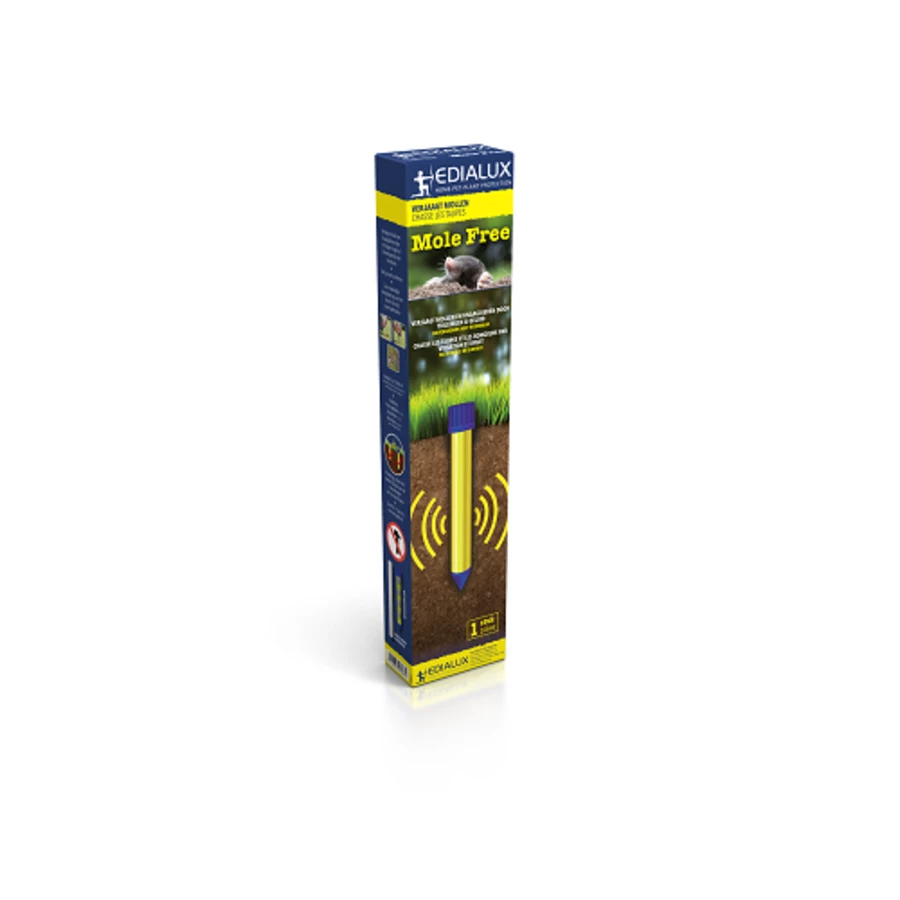 Verjaag mollen effectief met deze mollenverjager van Edialux die op 4 D batterijen werkt (niet inbegrepen, wel makkelijk mee te bestellen). De verjager verspreidt trillingen in de grond op een oppervlakte tot wel 1200 vierkante meter. Mollen vinden deze vibraties erg irritant en zullen na enkele weken uit uw tuin vertrekken.