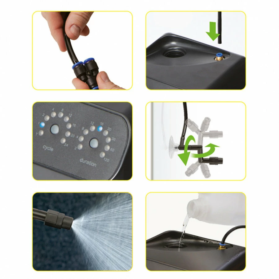 Het systeem kan worden geprogrammeerd zodat het elke 24-uren cyclus meerdere keren sproeit, met sproei-intervallen die 2 seconden tot 2 minuten kunnen duren. Het grote 8 liter reservoir verzekert een continue activiteit gedurende meerdere dagen zonder dat bijvullen noodzakelijk is (ideaal tijdens de vakantieperiode!), en het reservoir kan eenvoudig bijgevuld worden zonder dat het hele systeem gedemonteerd moet worden.