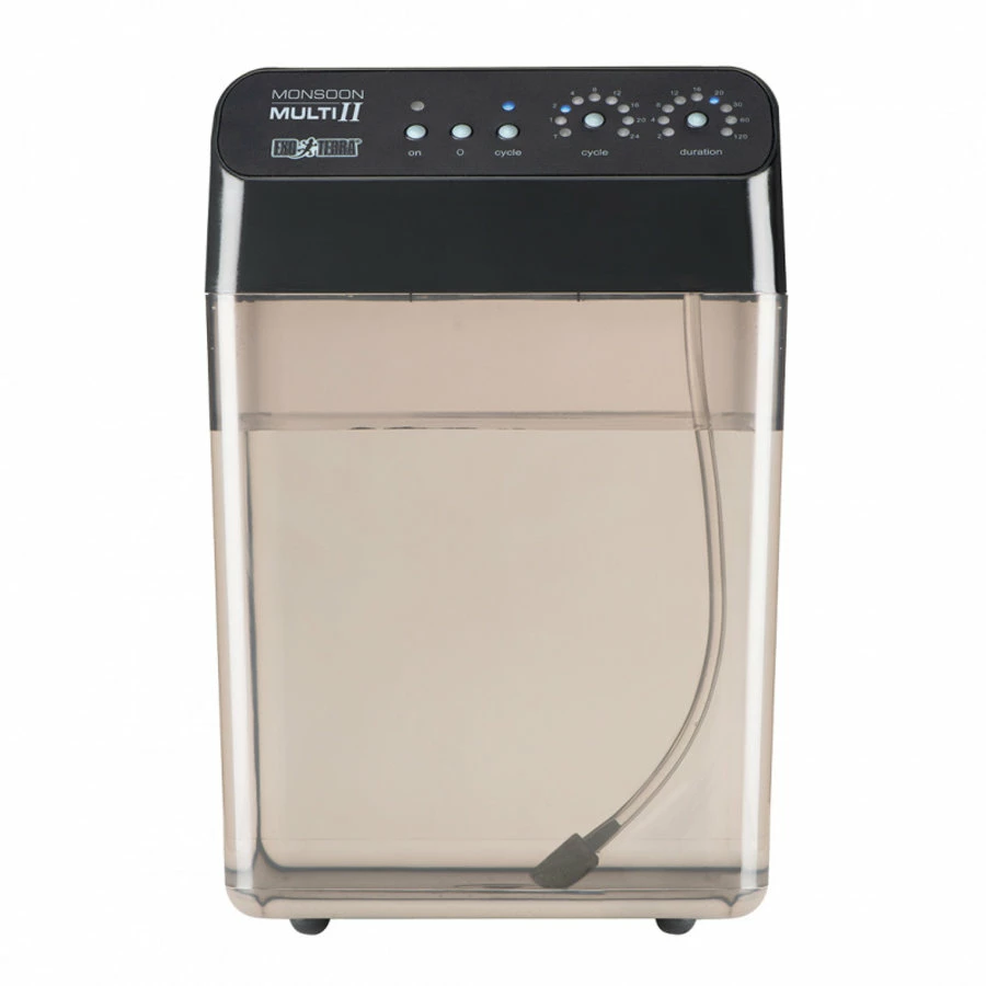 De neerslag die geproduceerd wordt door deze speciaal ontworpen sproeikoppen is uitermate fijn, waardoor een misteffect ontstaat in het terrarium of plantenkas, en de extra lange toevoerslang maakt het mogelijk het toestel onzichtbaar op te stellen in een aparte ruimte of in een Exo Terra Terrarium Cabinet onder het terrarium.