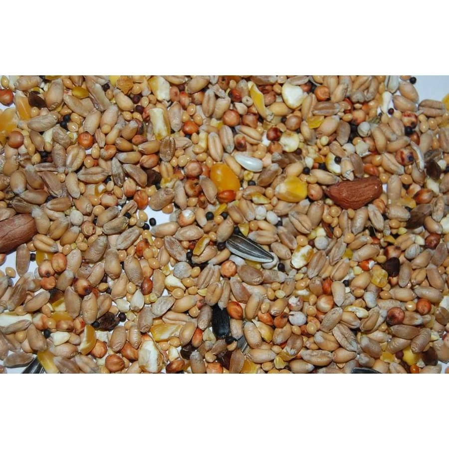 Tarwe, millet geel, dari rood, mais grutten, raapzaad, zonnepitten, dari wit, boekwijt, pinda’s gepeld en kardizaad.