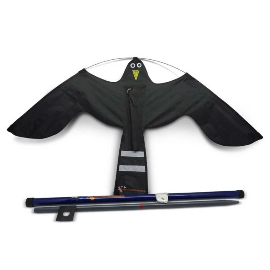 Dit maakt de Black Hawk Kite ideaal voor het beschermen van onder andere gewassen, boomgaarden, daken en parkeerterreinen. De set komt met vlieger, paal, en grondanker om de paal in de grond te plaatsen.