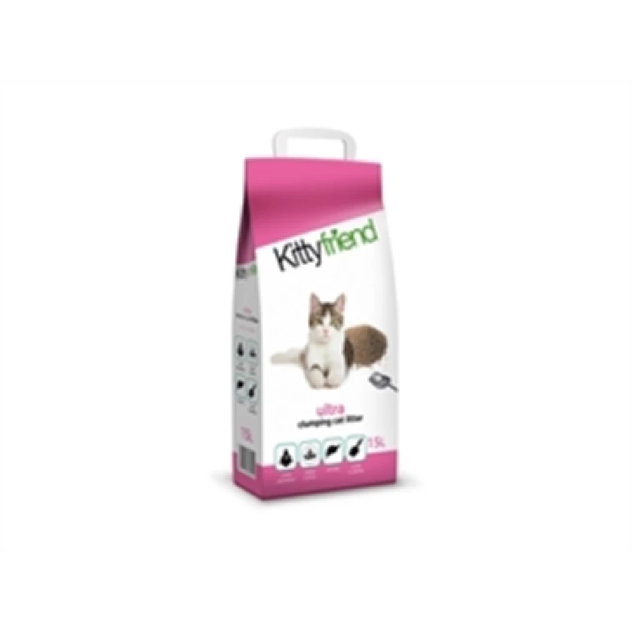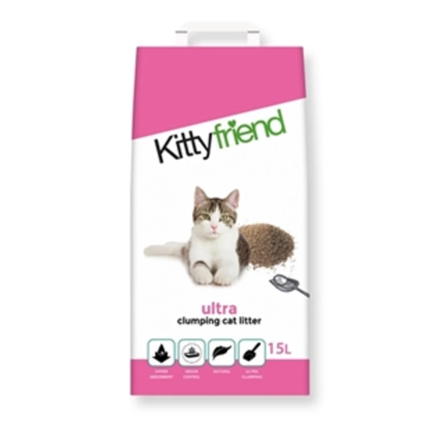 Kitty Friend Ultra Kattenbakvulling is kattenbakgrit met een maximaal klontvormend vermogen. Het grit is gemaakt van hoge kwaliteit bentoniet en bevat geen ingrediënten van schadelijke aard voor mens en dier. De bak blijft langer schoon door het ultra hoge absorptievermogen en daardoor is het grit veel zuiniger gebruik. Het grit vormt stevige klonten die ongewenste geurtjes neutraliseren. Gemakkelijk te vervoeren door het handvat.