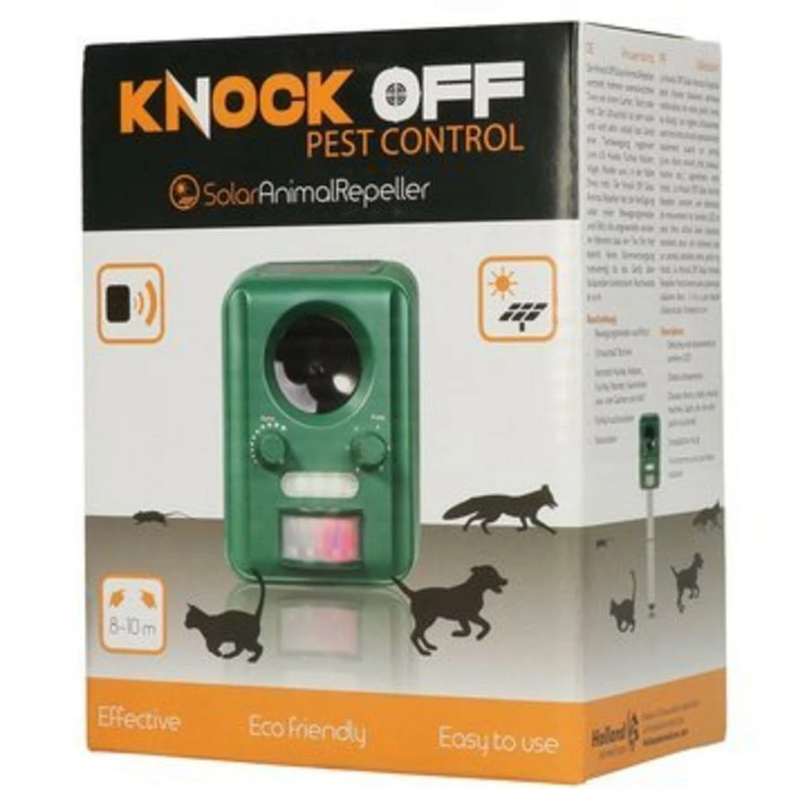 De Knock Off Solar Animal Repeller verjaagt meerdere ongewenste diersoorten uit uw tuin, vijver of erf. Het ultrasone signaal is zeer sterk en komt alleen in werking als er dieren (bijv. honden, vossen, katten, vogels, marters etc.) in de buurt komen. De Knock Off Solar Animal Repeller beschikt over een bewegingsmelder en flitslicht en kan op verschillende manieren ingesteld worden. De Knock Off Solar Animal Repeller werkt op zonne-energie. Werkt tot ca. 8-10 m afstand.