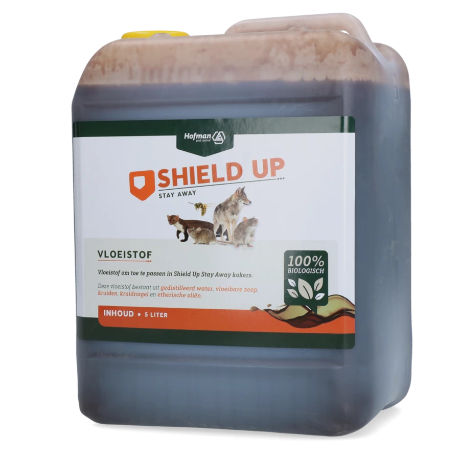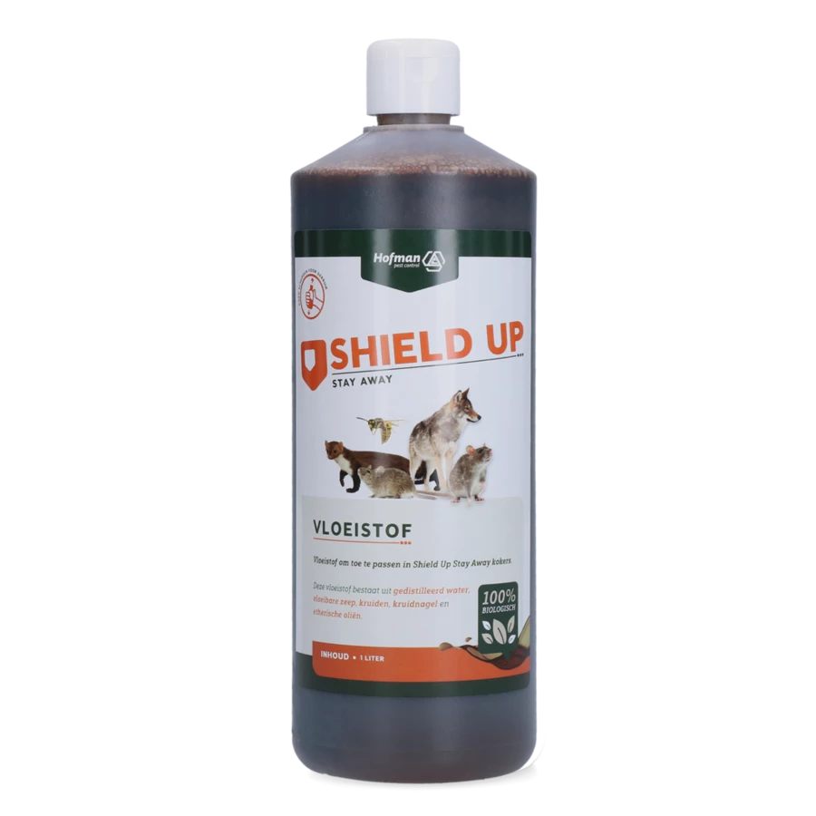 De Shield Up Stay Away Vloeistof is onder andere geschikt om toe te passen in de Shield Up Stay Away kokers en geurzuilen. De biologische vloeistof bestaat uit gedistilleerd water, vloeibare zeep, kruiden, kruidnagel en etherische oliën.