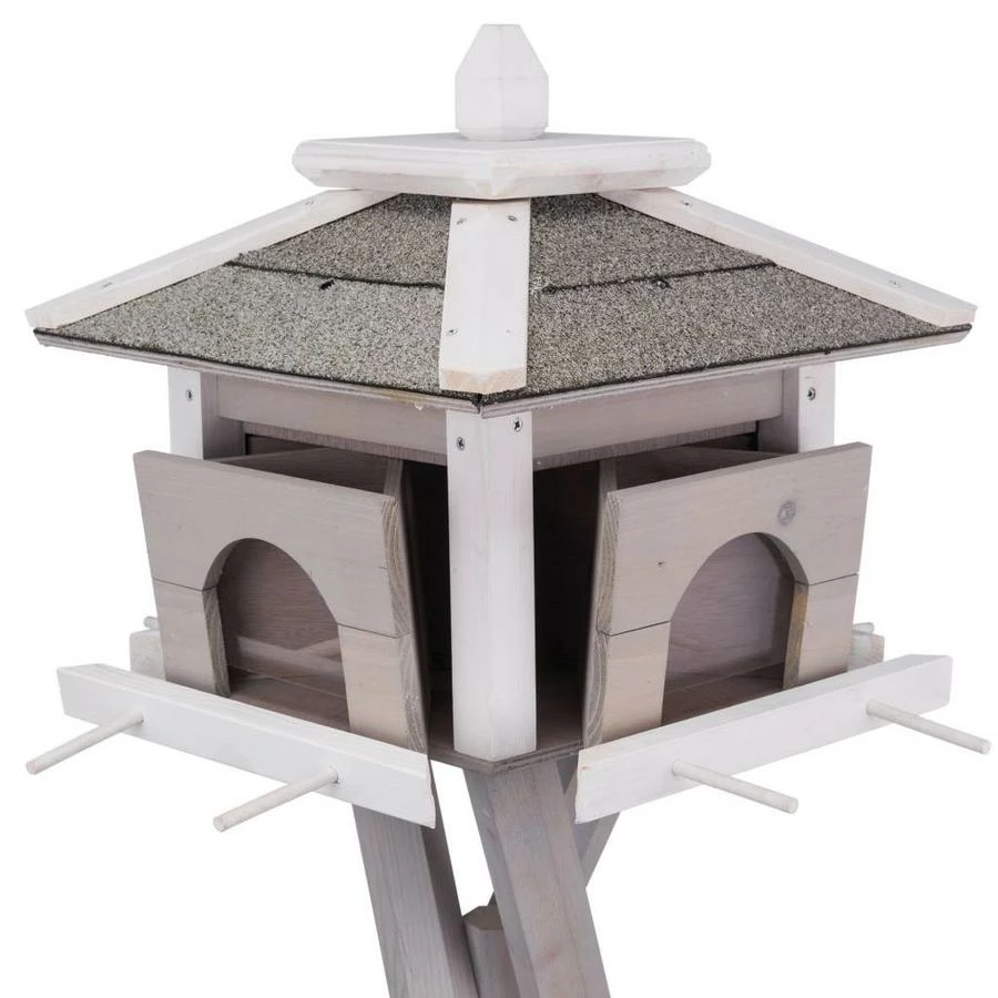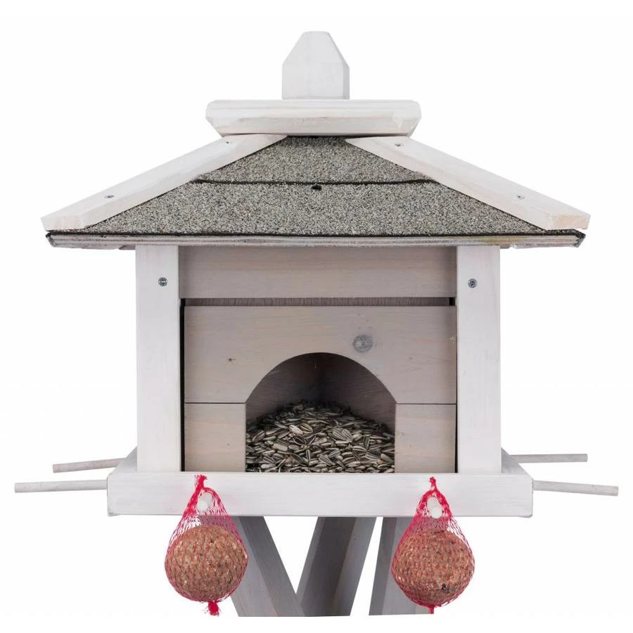Dit voerstation heeft meerdere compartimenten in het huisje waardoor u meerdere soorten voer tegelijk kunt aanbieden. Ook heeft dit voerstation extra houders voor mezenbollen en een extra plankje voor bijvoorbeeld een waterbakje of voer voor laag etende vogels.