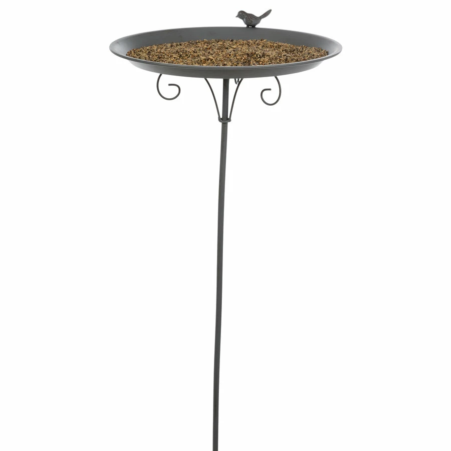 Deze schitterende schaal voor buitenvogels is te gebruiken als badschaal, drinkbak en als voerbak. De Schaal staat op een stevige prikker met 2 pennen en heeft een leuk vogeltje op de rand. De schaal ziet er oud en antiek uit en zal met de jaren nog meer gaan roesten en mooier worden. Hoogte: 85 cm.