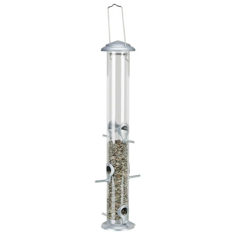 Voordelige voersilo met 6 landingsstokjes om uw volière of tuinvogels te voeren. Er past 1,3L voer in de silo.