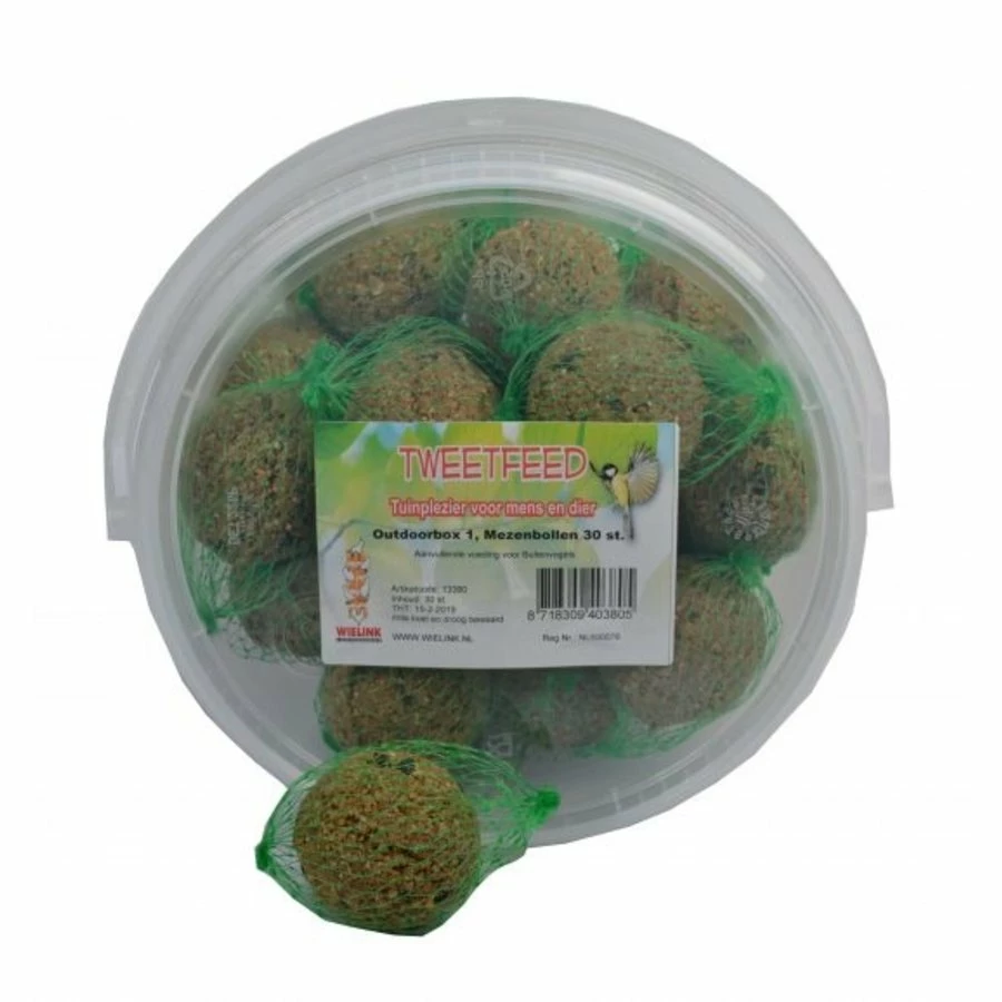 Outdoorbox mezenbollen met net voor de vogels in uw tuin.