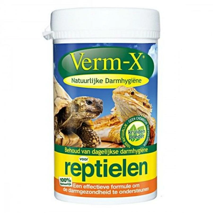 Verm-X Poeder voor Reptielen is een 100% natuurlijke formule voor een effectieve ondersteuning van de gezondheid van de darmen. Het poeder plakt goed aan insecten is daardoor een uitstekend aanvullend diervoeder.