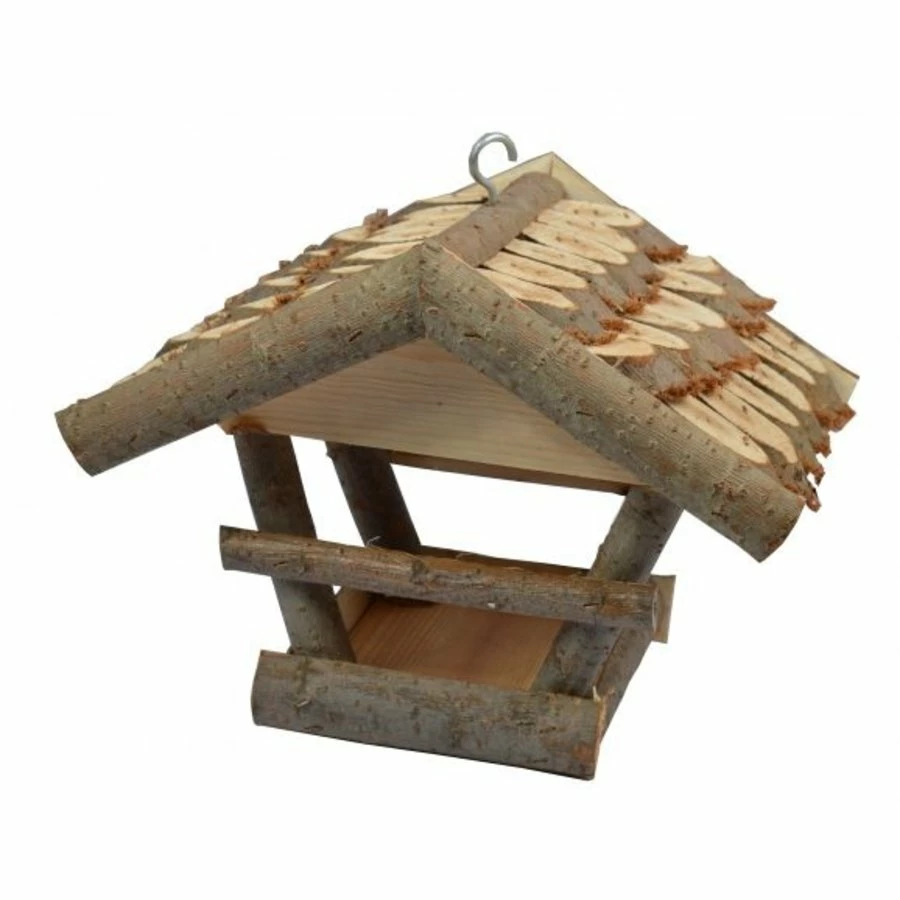 Prachtig vogel voer huisje met een dakje dat is gemaakt van schijfjes. Dit alles zorgt voor een natuurlijke uitstraling. Voederhuisje dat zowel hangend als staand kan worden gebruikt.